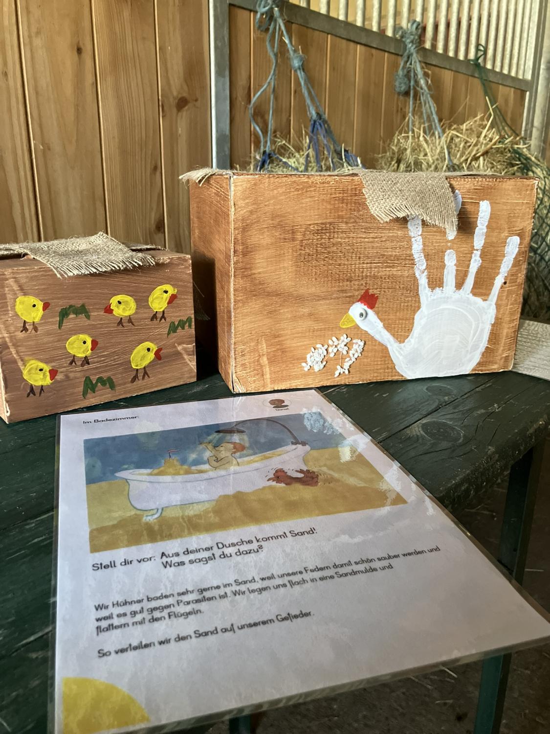 Die Kinder erleben die Hühner aus nächster Nähe, beobachten ihr Verhalten, erforschen ihre Bedürfnisse und dürfen an kleinen Lernstationen selbst aktiv werden.