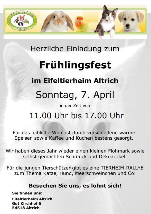 endlich öffnen sich wieder die Türen fürs traditionelle Tierheimfest. Am Sonntag, dem 07.04.2024 feiert das Eifeltierheim in Altrich ein Frühlingsfest.